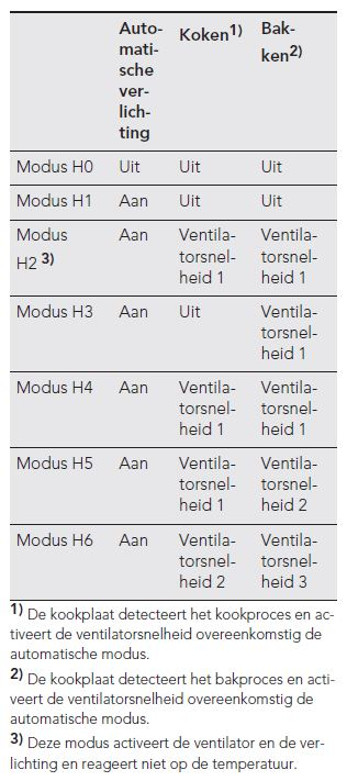 - Als de kookplaat uit de fabriek komt, staat de automatische modi ingesteld op H5. Modus H3 t/m H6 zijn afhankelijk van de temperatuur van de kookplaat.