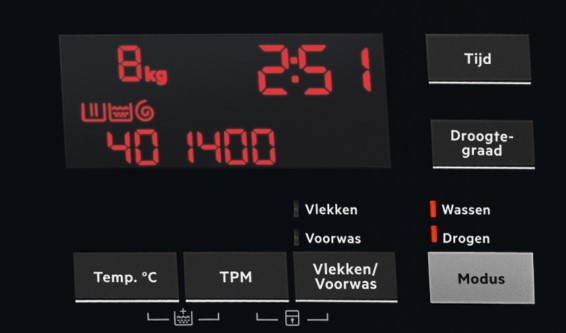 - Controleer of de beide lampjes boven de modus toets branden, alleen dan kan men was en drogen achter elkaar.