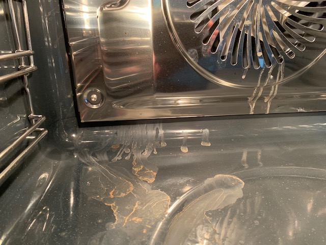 - Het kan voorkomen dat na het gebruik van een van stoomfunctie er een bruine vlek(ken) op de bodem van de stoomoven achter blijft, zoals in onderstaande afbeelding. Deze vlekken zijn afkomstig van vetten die gedurende het gebruik van de oven ontstaan door de producten die bereid zijn. Deze vetten zullen gedurende het gebruik van de stoomfuncties los komen en op de bodem van de oven komen. Reinig de oven regelmatig met de stoomreinigingsfunctie van de stoomoven of reinig de oven met een speciale ovenreiniger. Deze is verkrijgbaar via onze webshop, door hier te klikken.