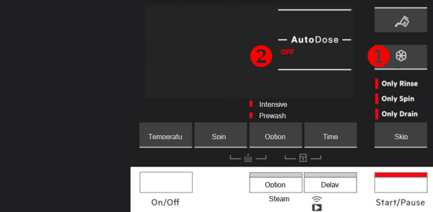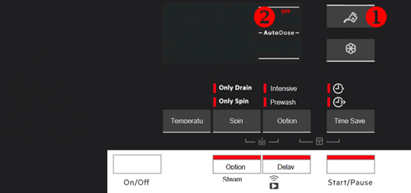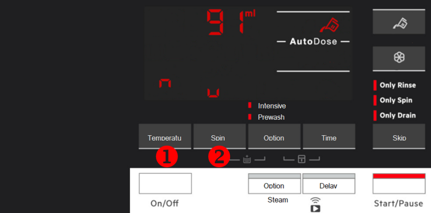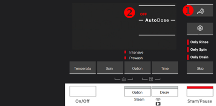 - Om de standaard wasmiddel dosering in te stellen, drukt u herhaaldelijk op de temperatuur knop (1) om de dosering naar boven aan te passen en op de centrifugeren knop (2) om deze naar beneden af te stellen.