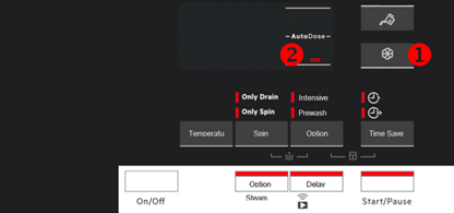 - Raak de knop wasverzachter tank (1) aan. Het display toont OFF (2).