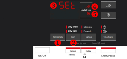 - Om naar de configuratiemodus te gaan, houdt u de temperatuur- (1) en de centrifugeknoppen (2) tegelijkertijd een paar seconden ingedrukt totdat het display "SET" (3) links op het display toont en een wasmiddeltank knippert (4) en wasverzachtertank (5) symbolen rechts op het display.
