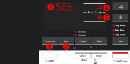 - Om naar de configuratiemodus te gaan, houdt u de temperatuur- (1) en de centrifugeknoppen (2) tegelijkertijd een paar seconden ingedrukt totdat het display "SET" (3) links op het display toont en een wasmiddel tank knippert (4) en wasverzachter tank (5) symbolen rechts op het display.
