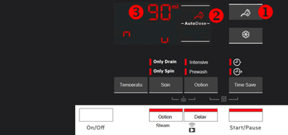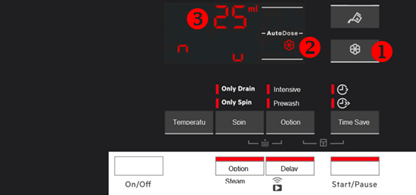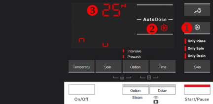 Als er geen andere actie wordt ondernomen, keert het display na 10 seconden terug naar het programma en blijft de AutoDose-wasmiddel tank uitgeschakeld. HET KAN NIET WORDEN GEACTIVEERD IN STANDAARDMODUS. Om het te activeren, moet u de configuratiemodus opnieuw uitvoeren.- Druk nogmaals op de knop voor wasmiddel tank (1). Het display toont tanksymbool (2) en het standaard wasmiddel dosering (3).